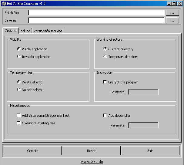 Bat To Exe Converter 1.5.0.0 免安裝版 http://azo-freeware.blogspot.com/2009/07/bat-to-exe-converter-1500.html